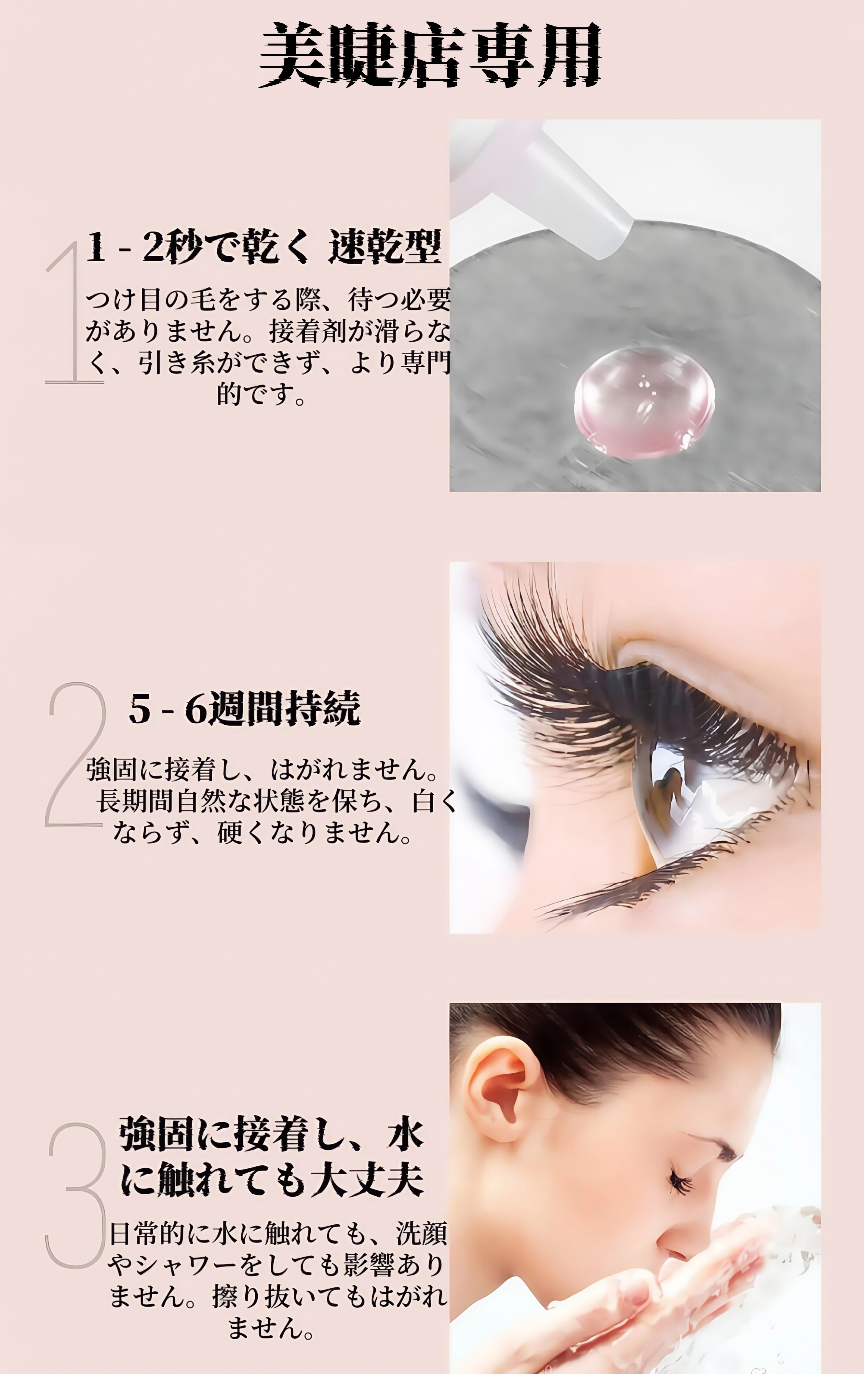 TOPBONのまつげ接着剤は、まつげショップ特製のピンクゼリータイプで、ヌードメイク効果を実現し、跡が残らず自然な仕上がりを提供します。